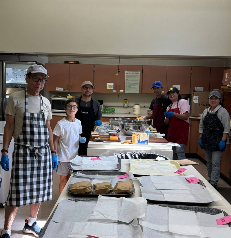 Six people of varying ages, genders, and ethnicities face the camera while standing in the Midwest Buddhist Temple's kitchen. Trays hold sandwiches in the process of being assembled. Photo is from the temple's Facebook page.