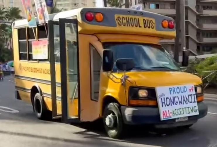 A video screenshot of a mini school bus, with a sign on the front reading "Proud of Hongwanji, All-Accepting" and various rainbow-themed signs on the side showcasing LGBTQ support by Hongwanji institutions such as the Pacific Buddhist Academy.